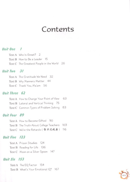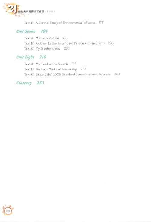 3.根据广大师生的建议,我们将《读写教程》由原来的每册10个单元减为每册8个单元,按课文的难易度对前后顺序适当作一些调整,更换一些内容已显过时的课文,每册更换课文6-8篇,对课文后的练习作一些改动,在课文B后增加两项词汇练习,每个单元后增加一些格言、谚语、小幽默或诗歌等,并从第三册起在课后练习中新增段落翻译。此次修订替换内容达30%以上;