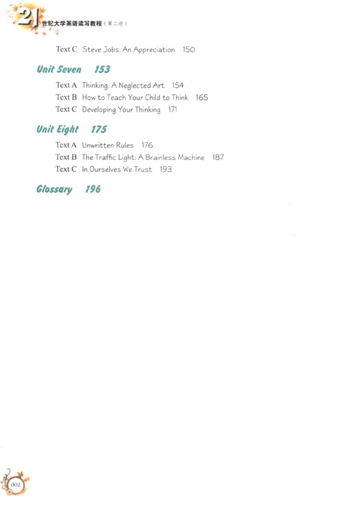 2.鉴于新《课程要求》强调了阅读(包括快速阅读)技能的培养要求,我们已请复旦大学资深教授、《21世纪大学英语》主编之一张增健先生新编一套《全新版快速阅读教程》1-4册,其选材内容在主题上亦与《读写教程》一致,作为整套教材的一部分;