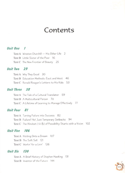 3.根据广大师生的建议,我们将《读写教程》由原来的每册10个单元减为每册8个单元,按课文的难易度对前后顺序适当作一些调整,更换一些内容已显过时的课文,每册更换课文6-8篇,对课文后的练习作一些改动,在课文B后增加两项词汇练习,每个单元后增加一些格言、谚语、小幽默或诗歌等,并从第三册起在课后练习中新增段落翻译。此次修订替换内容达300/0以上: